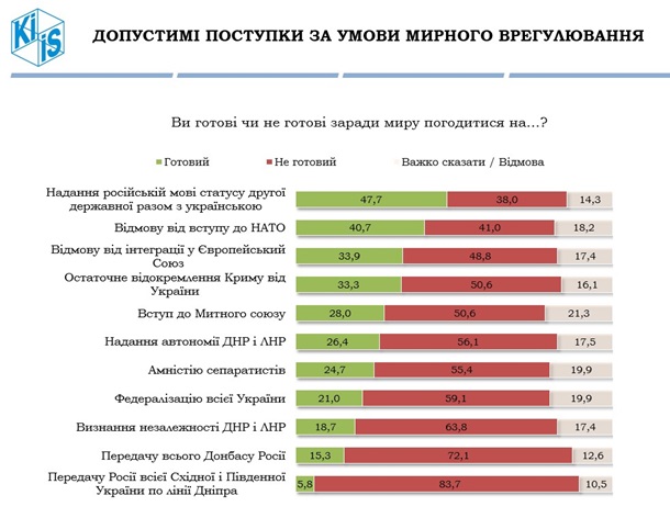 Kết qua chỉ ra rằng 26,4% vì hòa bình cũng đồng ý cho tự trị DNR và LNR tự phong, 24,7% – ân xá cho ly khai, 21% – liên bang hóa toàn Ukraina.
