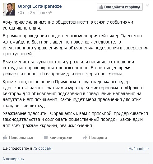 "Trong khuôn khổ tiến hành điều tra Rezvushkin, lãnh đạo Avtomaidan Odessa đã được mời đến gặp điều tra viên của cục điều tra với nghi ngờ thực hiện hành vi phạm tội. Anh ta bị kết tội: côn đồ và đe dọa hay bạo hành đối với các nhân viên của các cơ quan bảo vệ pháp luật. Hiện tại đang quyết định vẫn đề lựa chọn hình thức giam giữ" - ông viết.